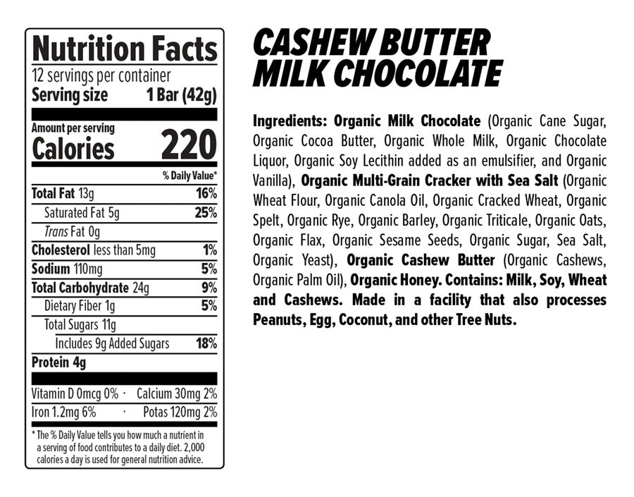 All organic ingredients, no artificial flavors, colors or preservatives and True Source honey. Organic nut butter and honey sandwiched between two multigrain crackers sprinkled with sea salt then covered in milk chocolate.